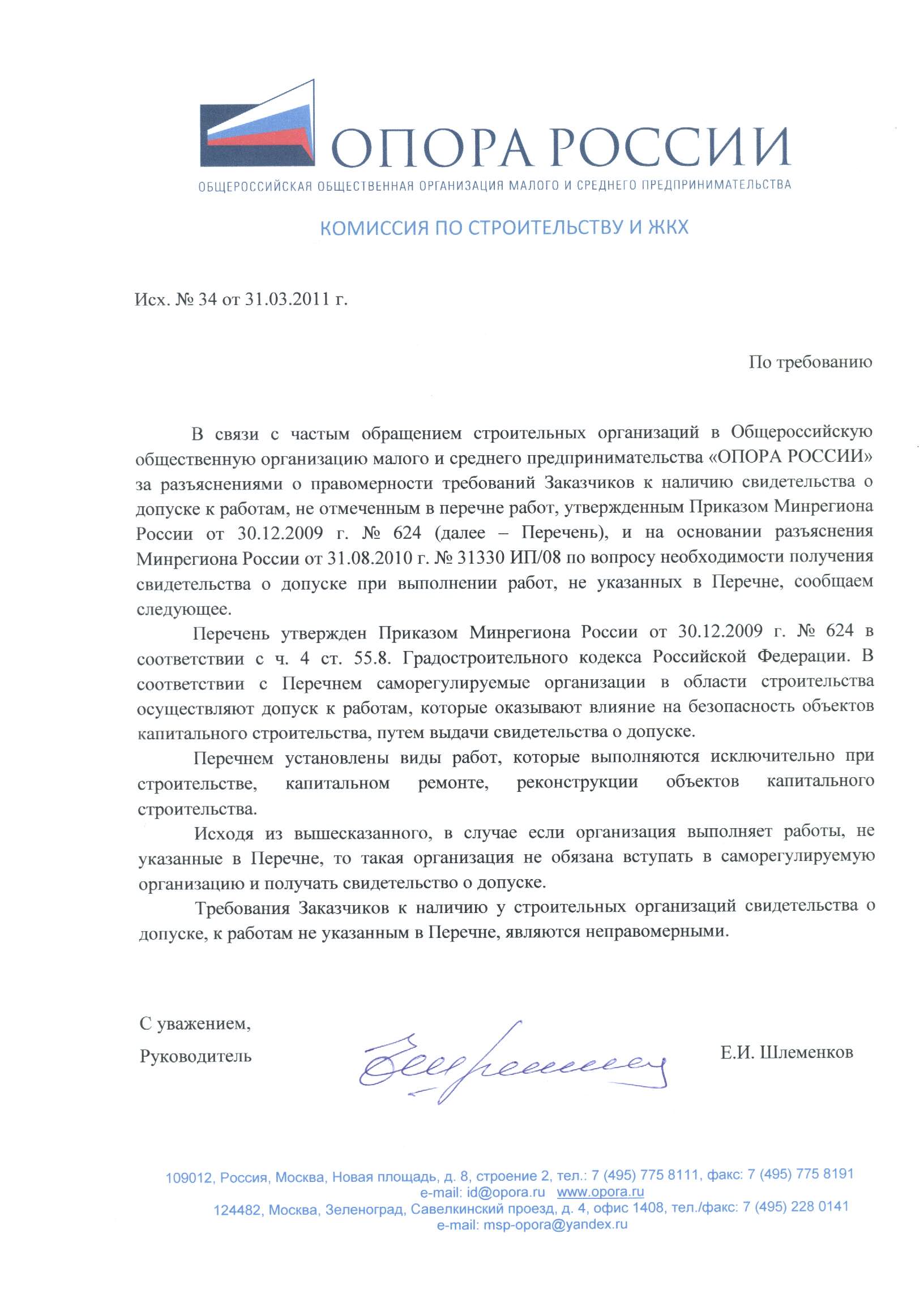 Разъяснения по вопросу необходимости получения свидетельства о допуске при выполнении работ, не указанных в Перечне видов работ, утвержденном Приказом Минрегиона России от 30.12.2009 г. №624